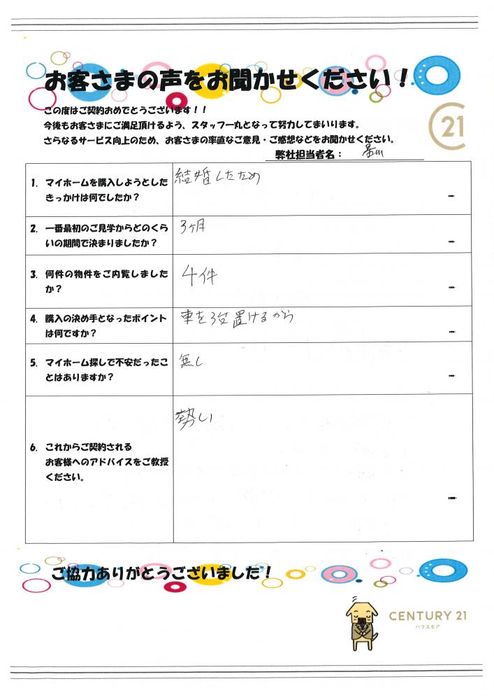 ご結婚を機にマイホーム購入のお手伝いができ大変嬉しく思います。